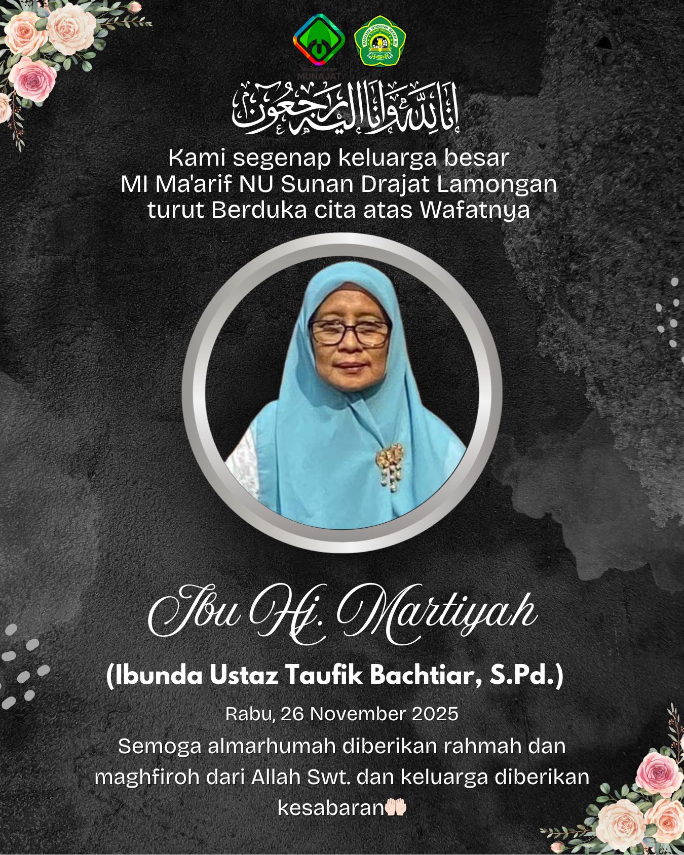 Keluarga besar MI Ma’arif NU Sunan Drajat Lamongan mengucapkan turut berduka cita yang sedalam-dalamnya atas wafatnya: