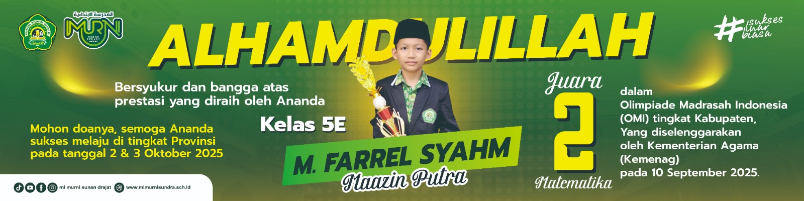 🌟 Alhamdulillah, bersyukur dan bangga atas prestasi yang diraih oleh Ananda M. Farrel Syham Maazin Putra, Kelas 5E 🏆Juara 2 Matematika dalam Olimpiade Madrasah Indonesia (OMI) tingkat Kabupaten, Yang diselenggarakan oleh Kementerian Agama (Kemenag) pada 10 September 2025.Mohon doanya, semoga Ananda sukses melaju di tingkat Provinsi. 🙏✨