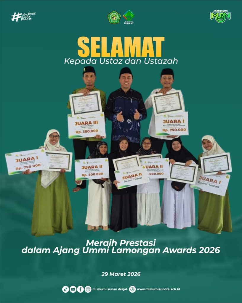 Rangkaian penghargaan ini semakin menegaskan komitmen MI Ma’arif NU Sunan Drajat Lamongan dalam menjaga kualitas pendidikan Al-Qur’an serta terus melahirkan generasi Qur’ani yang unggul, berkarakter, dan berdaya saing. ✨📖 (MCM)