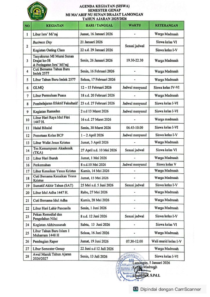 MI Ma’arif NU Sunan Drajat Lamongan telah menetapkan Agenda Kegiatan Siswa Semester Genap Tahun Ajaran 2025/2026 sebagai pedoman pelaksanaan kegiatan akademik dan nonakademik peserta didik. Agenda ini disusun untuk mendukung proses pembelajaran yang terencana, terarah, dan seimbang antara penguatan akademik, karakter, serta spiritual siswa.