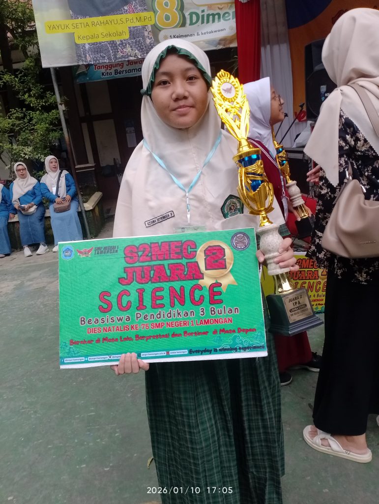 Kepala Madrasah, Ustaz Ubaidillahh, S.Pd.I., menyampaikan rasa syukur dan apresiasi atas capaian luar biasa tersebut. Beliau mengucapkan terima kasih kepada para siswa, guru pembimbing, serta wali murid atas dukungan dan doa yang diberikan. Rasa kebersamaan dan kebanggaan tampak saat selebrasi kemenangan bersama para juara, guru, dan alumni yang turut hadir di SMP Negeri 1 Lamongan.