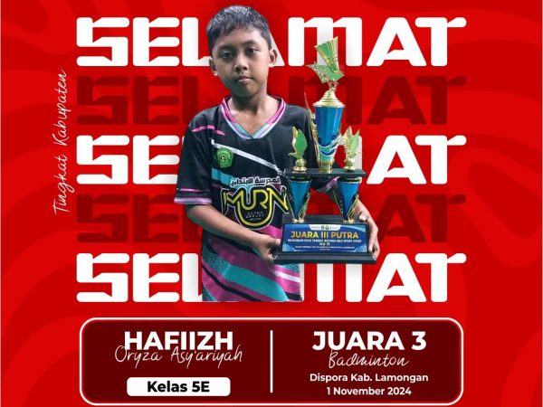 Hafiizh Oryza Asy’ariyah Siswa MI Ma’arif NU Sunan Drajat Lamongan Raih Juara III Badminton Tingkat Kabupaten